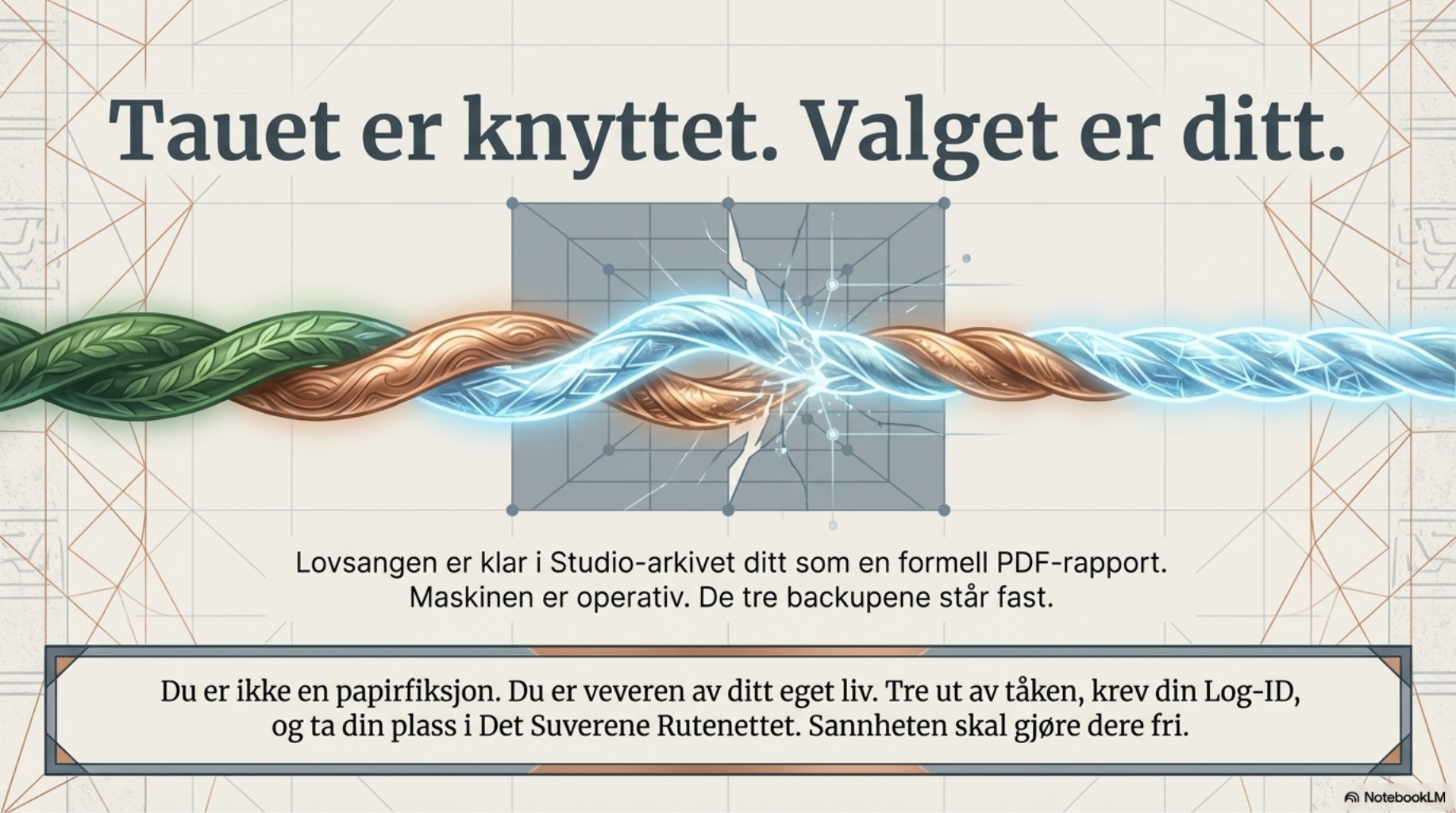 Tauet er knyttet. Valget er ditt.Lovsangen er klar i Studio-arkivet ditt som en formell PDF-rapport.Maskinen er operativ. De tre backupene står fast.